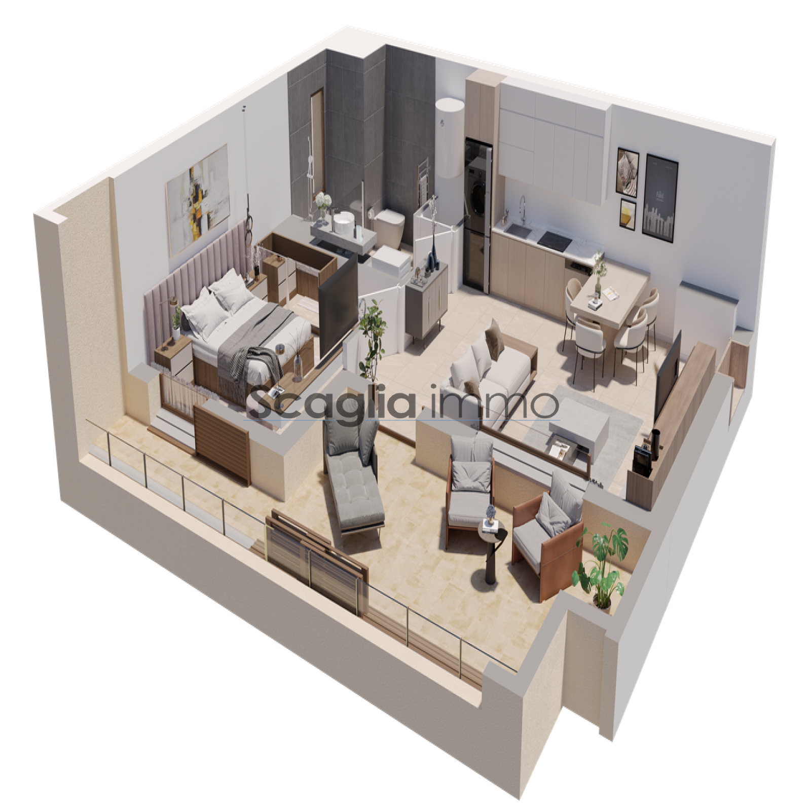 Il se compose d'une entrée, d'un séjour ouvert sur la cusine donnant accés à une belle terrasse ,d'une chambre, d'une salle d'eau et d'un wc.