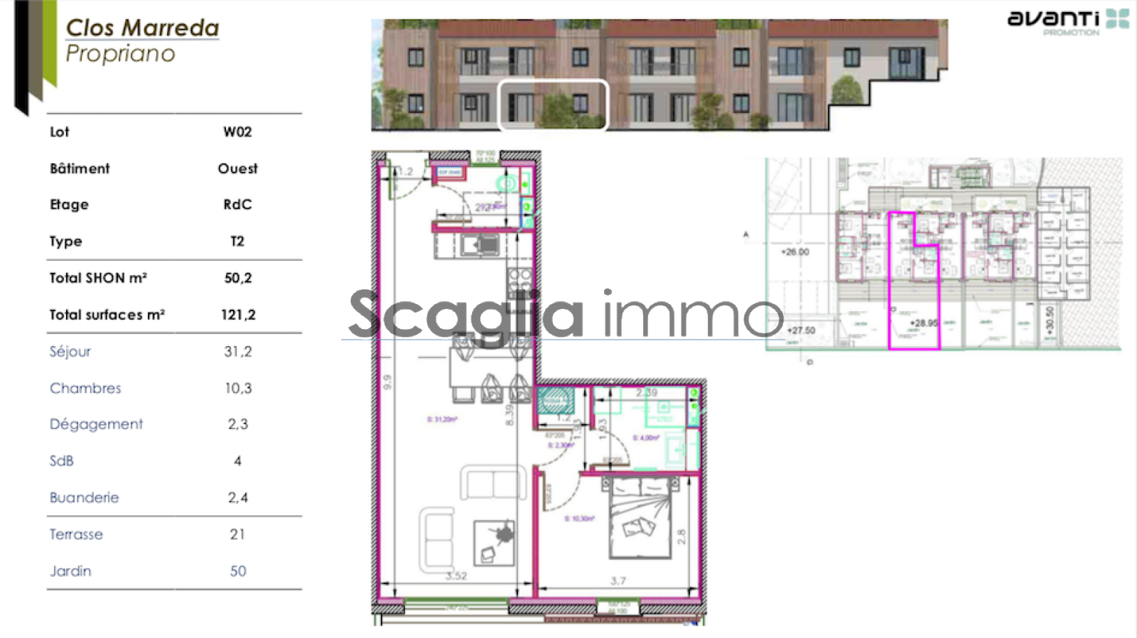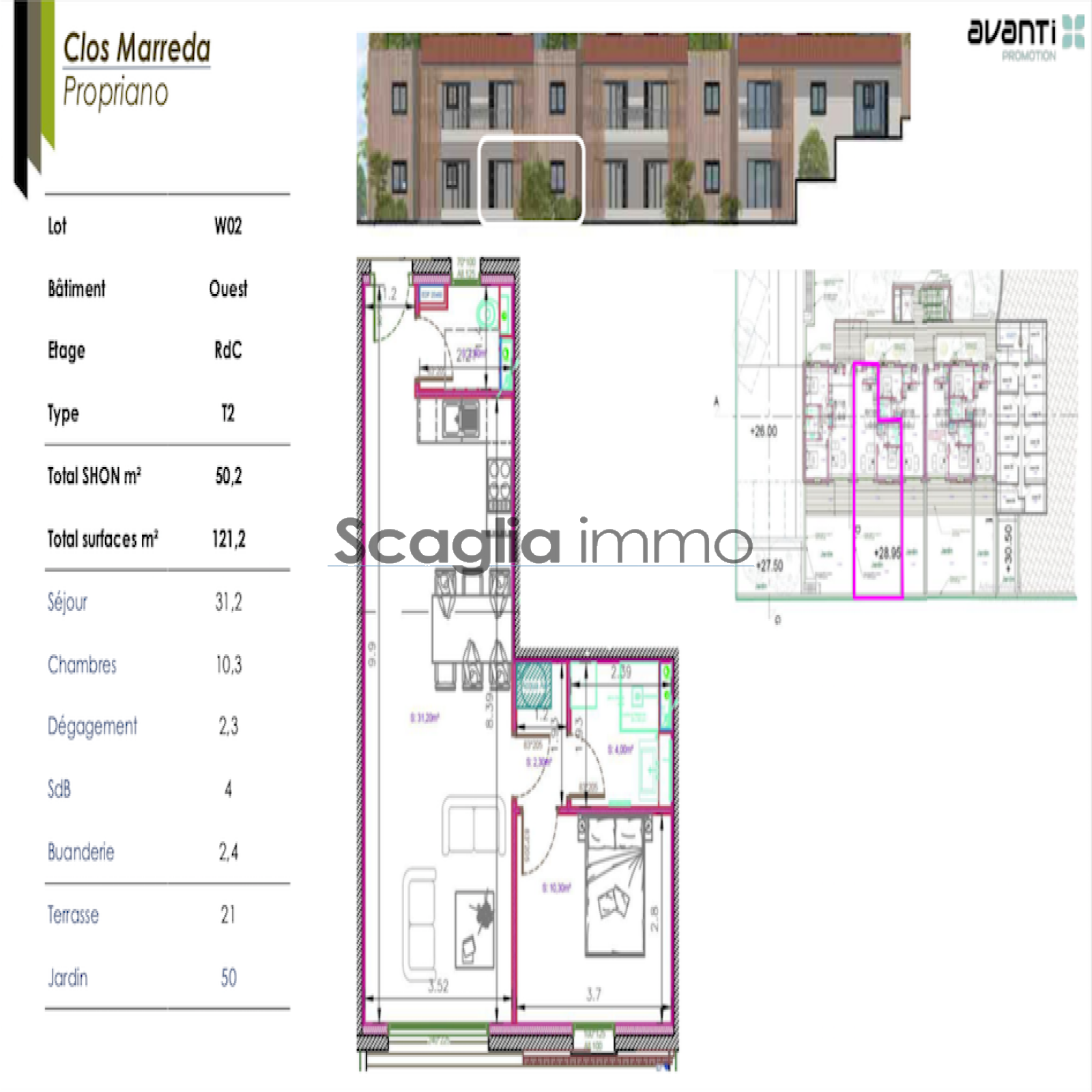 L'agence SCAGLIA Immo vous propose à la vente cet appartement de type 2 en VEFA au rez-de-chaussée. La superficie habitable est de 50.2 m² avec un jardin privatif de 50 m², une terrasse de 21 m², et une cuisine équipée incluse dans le prix. Idéalement situé dans une résidence neuve, sécurisée et respectueuse de l’environnement de 30 logements avec piscine collective. Ce programme bénéficie d’un emplacement privilégié à proximité du port de commerce de Propriano, des plages et des commodités.