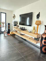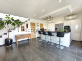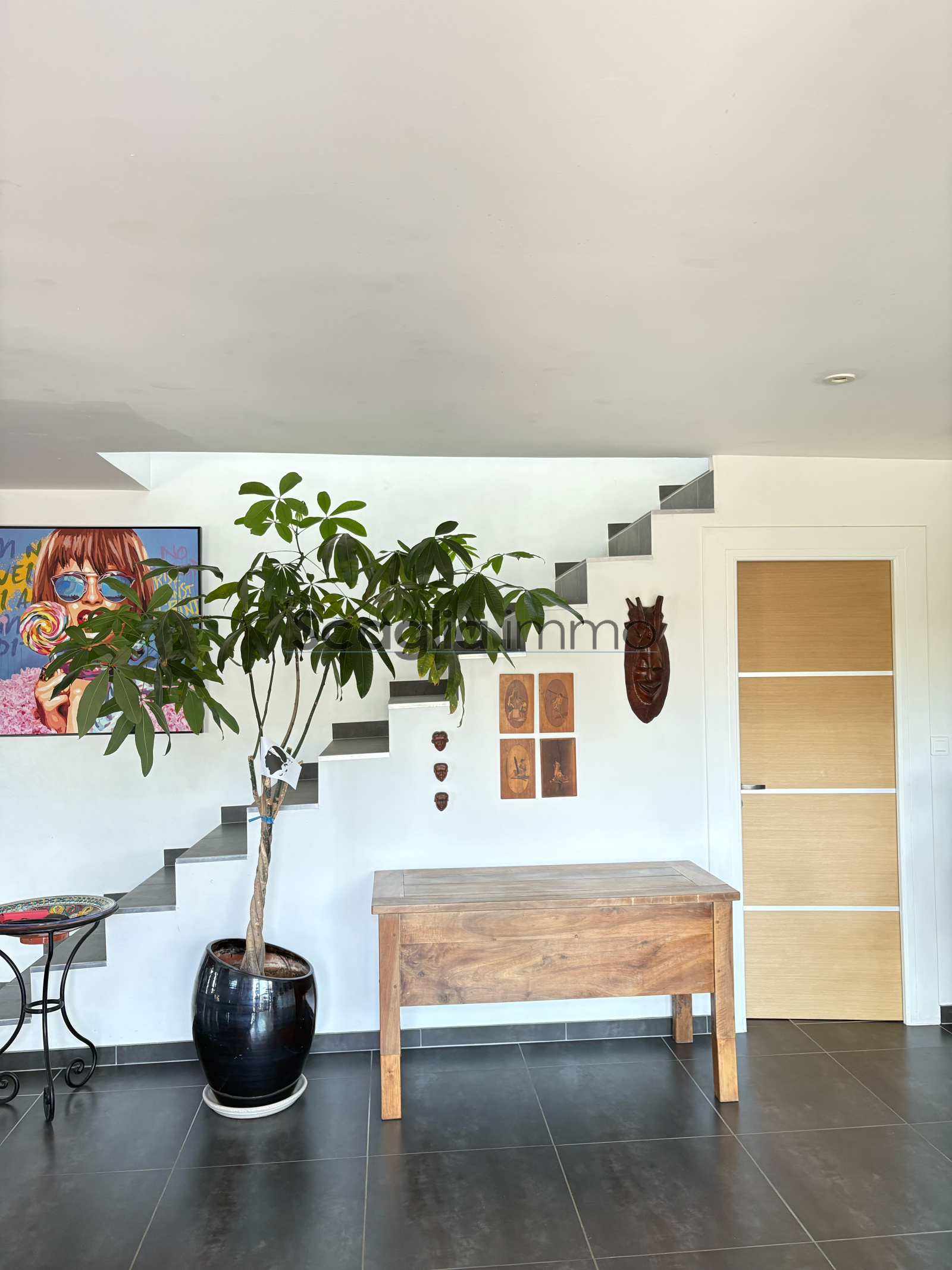 Sur deux niveaux, elle est composée en rez-de-chaussée d'un vaste séjour ouvert sur la cuisine de plus de 59 m² avec accès à une belle terrasse sans vis à vis, d'un WC visiteur et d'un grand rangement intégré.