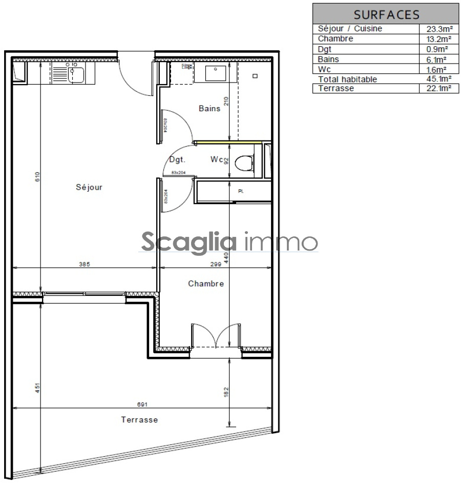 Appartement 2 pièce(s) 1 chambre(s) 45 m²